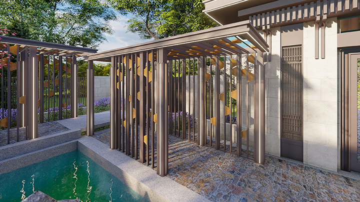 中国古建筑多种元素的灵活运用,营造东方花园的华贵印象。同时,现代感的几何线条穿插于文华之间,彰显出鲜明的时代气息。