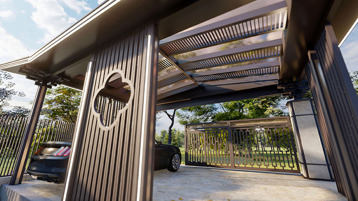 投影面积:7.4*8.3m;立柱型材:213*213mm;壁厚2.0-4.0mm;顶部型材:外框50*150*2.0mm;大梁50*150*2.0mm;龙骨50*100*2.0mm